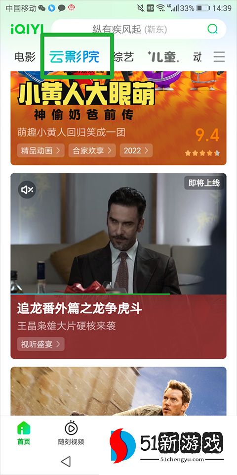 1、用户可以在手机上进入爱奇艺主页界面,点击顶部导航栏中的“云影院”按钮(在下图中的绿色框区域内),进入云影院视频部分。