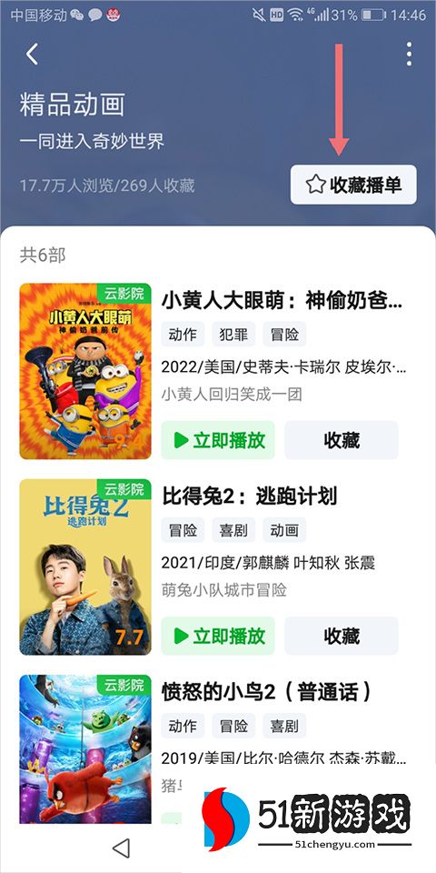 3、进入分类区域后,用户可以选择一部电影,点击“立即播放”或点击“收藏”进行保存。他们还可以点击页面右上角的“收藏播放列表”(如下图中的红色箭头所示)来保存此分类区域。