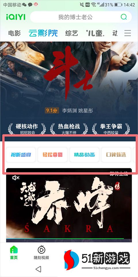 2、用户可以根据不同的类别选择要观看的电影,类别导航栏位于页面中间(下图红框区域内)。