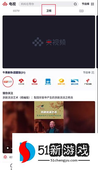 2、然后左右滑动CCTV频道,点击顶部切换到[卫星电视],点击[节目列表]查看当前频道的所有节目。